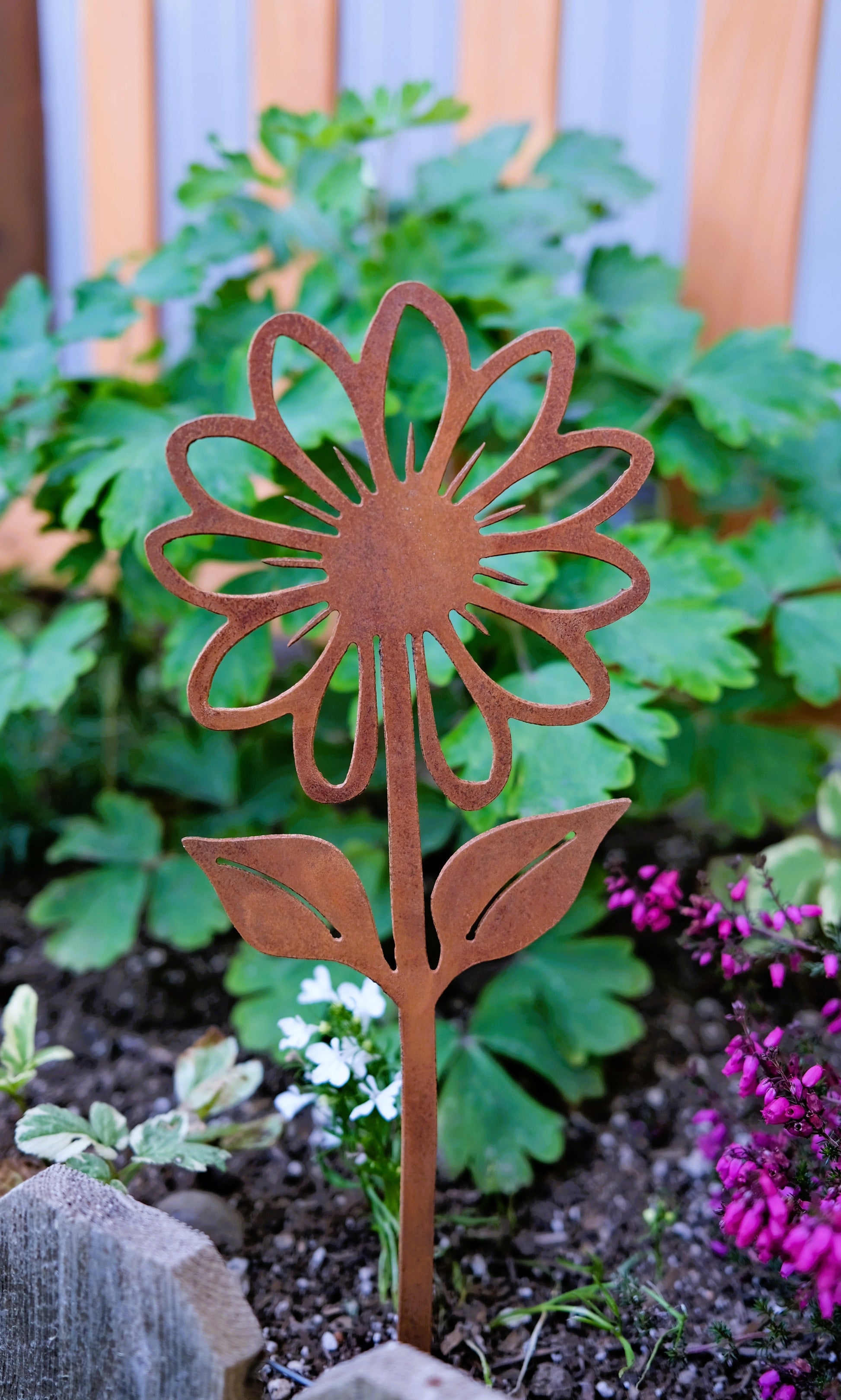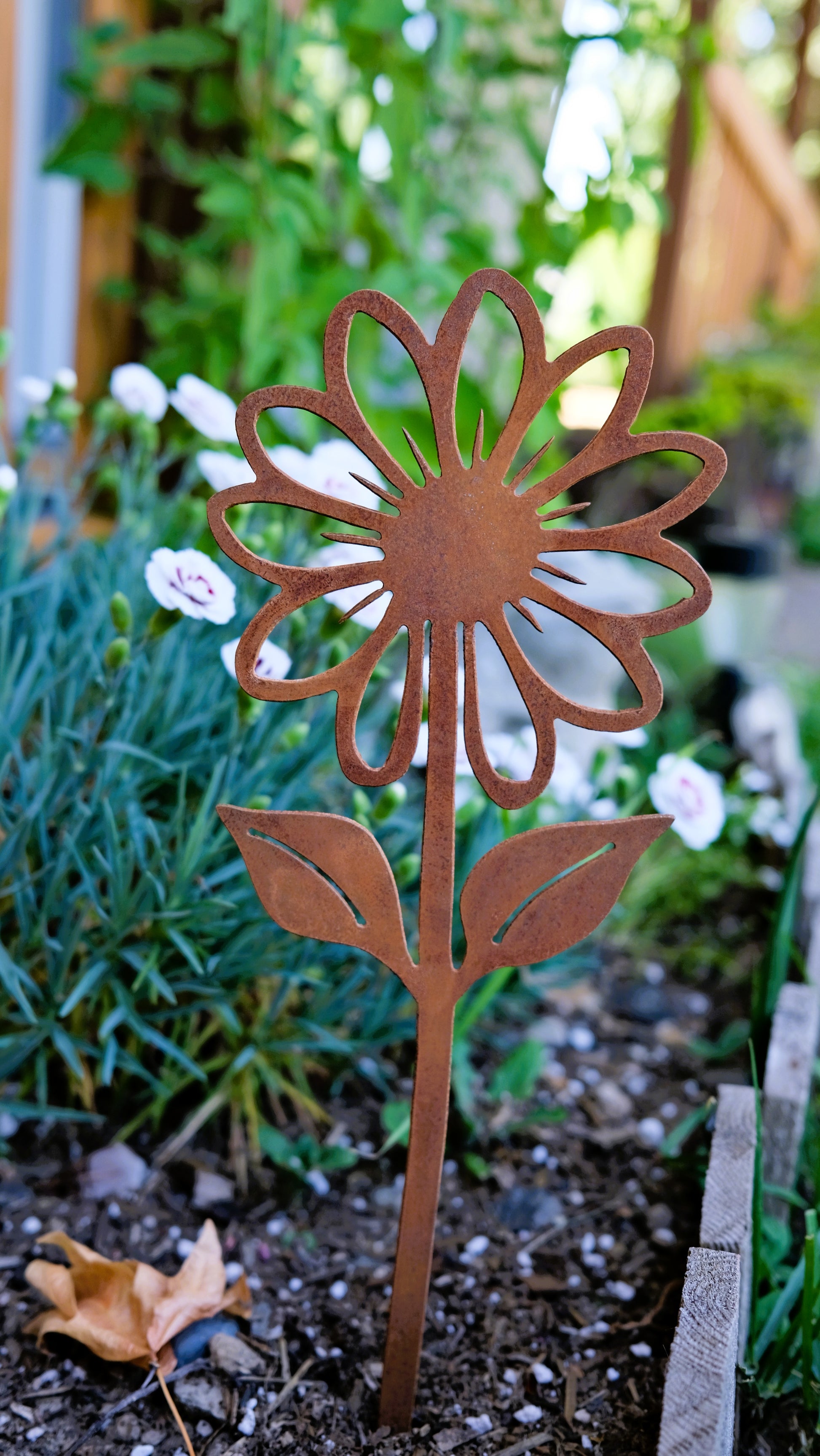 5" rusted metal daisy, overall height is 15". Stem comes to a tapered point to easily add to your garden-scape, it can also be bent to achieve your desired look!