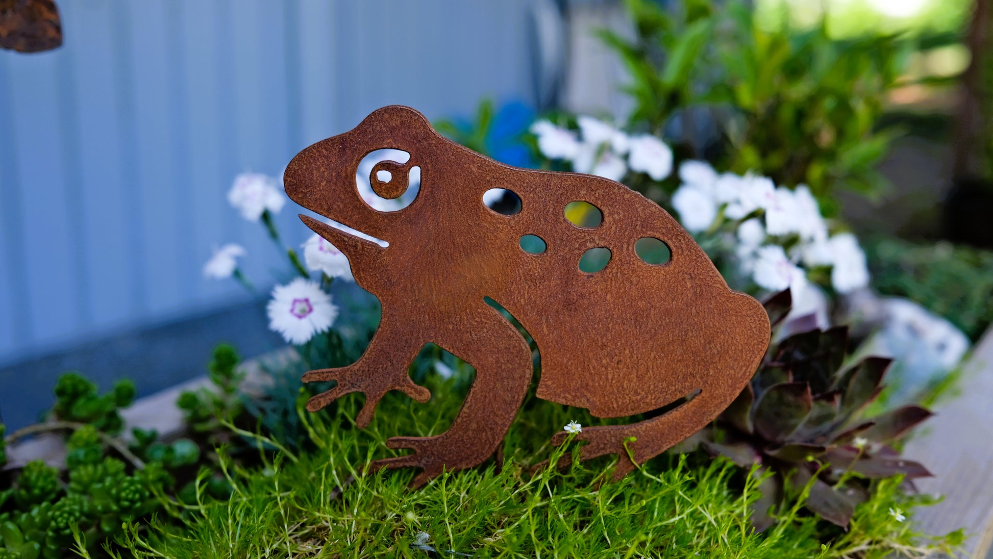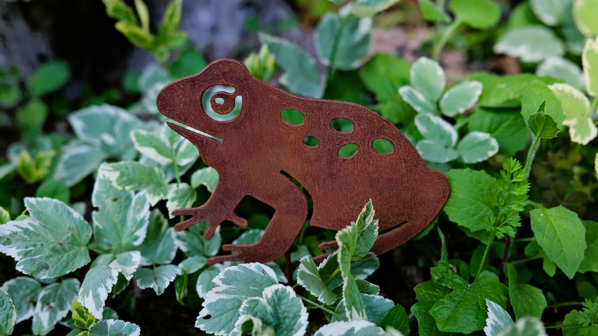 Rusted metal frog on stake